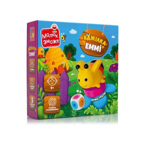 Настільна гра “Бджілка Еммі” – Бемць! Щось гепнулося на квітку поруч із бджілкою Еммі й верескнуло: “Будь ласка, допоможи!”. Виявляється, маленьке сонечко Цяточка заблукало. Еммі залюбки допомогла малечі відшувати дім, але наразі бджілка сама потребує вашої допомоги. Зовсім скоро настане вечір. Хутчіш літайте разом із нею з квітки на квітку. Ваша мета допомогти бджілці дістатися до вулика. Кидай кубик щоб допоможіть бджілці Еммі зібрати нектар з квітів і повернутися до вулика. Гра розвиває логічне мислення та рухові навички.