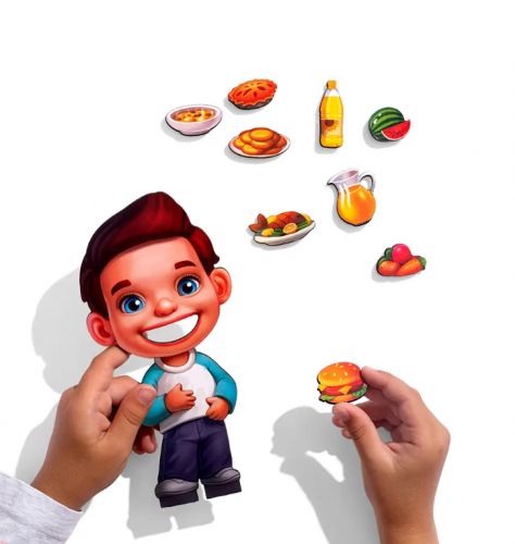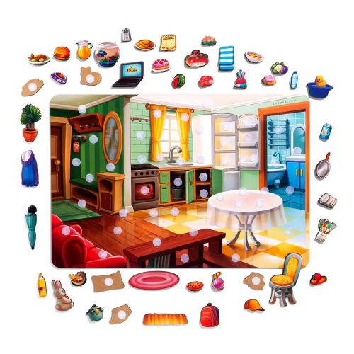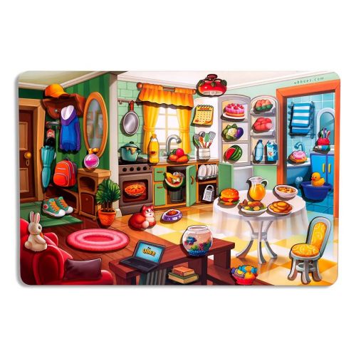 Гра складається з основи-планшета з малюнком кімнат в будинку і деталей, які кріпляться до основи на липучка. Потрібно навести порядок у кімнати і прикріпити усі предмети на свої місця, а потім ще погодувати малюка( хлопчик на підставці), пограти в “їстівне/не їстівне” (плашки треба просовувати йому до рота.