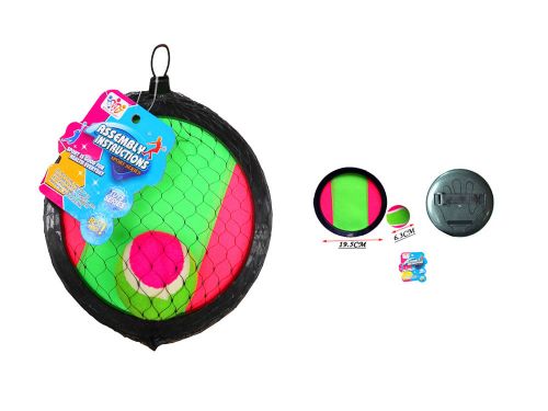 У набір входить: кольорові пастки для м’яча і сам м’яч. М’ячик з липучками, легко і міцно прилипає до рукавичці. Діаметр рукавички – 20 см. Діаметр м’яча – 6 см.