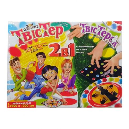 Настільна, гра+гра на підлогу 2 в 1 “Твістер гранд + Твістерок”. Правила гри: гравець крутить рулетку, яка показує яку руку або ногу поставити на гурток певного кольору. Не можна торкатися “поля” колінами і ліктями. Друга гра – все те ж саме, але в грі задіяні тільки пальці.