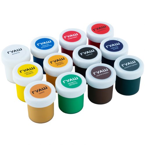 Гуаш Kite містить 12 кольорів. Баночки по 20 мл зберігаються в картонній упаковці. Кольори яскраві і насичені, легко змішуються. Фарби приємної однорідної текстури, рівномірно наносяться на поверхню. Змиваються зі шкіри та інших поверхонь мильною водою. Фарби сприяють емоційному та мовному розвитку дитини, а також сприйняттю кольорів. Дитина навчиться змішувати фарби і створювати нові кольори. Дитячі фарби нейтрального запаху. Фарби виготовлені з натуральних компонентів з додаванням консервантів, не містять шкідливих речовин. Рекомендовано дітям дошкільного та шкільного віку.
