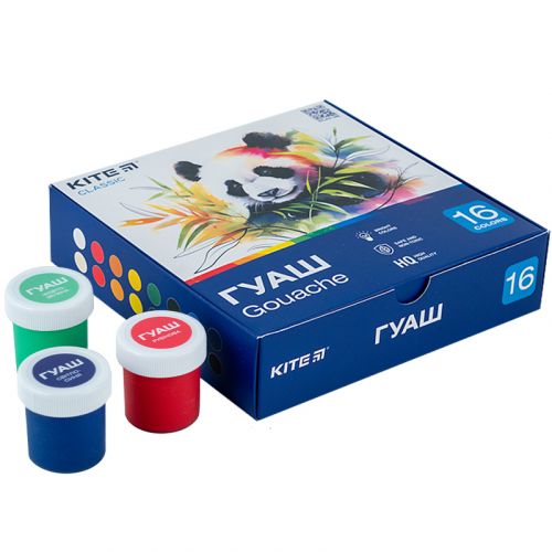 Гуаш Kite містить 16 кольорів. Баночки по 20 мл зберігаються в картонній упаковці. Кольори яскраві і насичені, легко змішуються. Фарби приємної однорідної текстури, рівномірно наносяться на поверхню. Змиваються зі шкіри та інших поверхонь мильною водою. Фарби сприяють емоційному та мовному розвитку дитини, а також сприйняттю кольорів. Дитина навчиться змішувати фарби і створювати нові кольори. Дитячі фарби нейтрального запаху. Фарби виготовлені з натуральних компонентів з додаванням консервантів, не містять шкідливих речовин. Рекомендовано дітям дошкільного та шкільного віку.