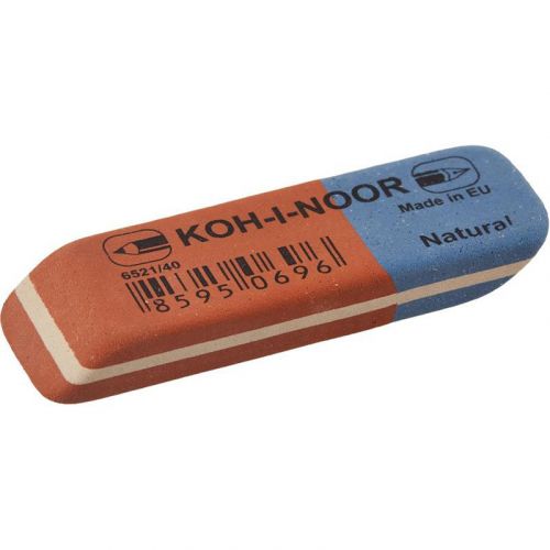 Комбінована гумка з натурального каучуку. Червона сторона – м’яка, для стирання сліду олівців твердості 8В-10Н. Синя сторона – містить абразивні речовини, для стирання сліду ручок,чорнила.