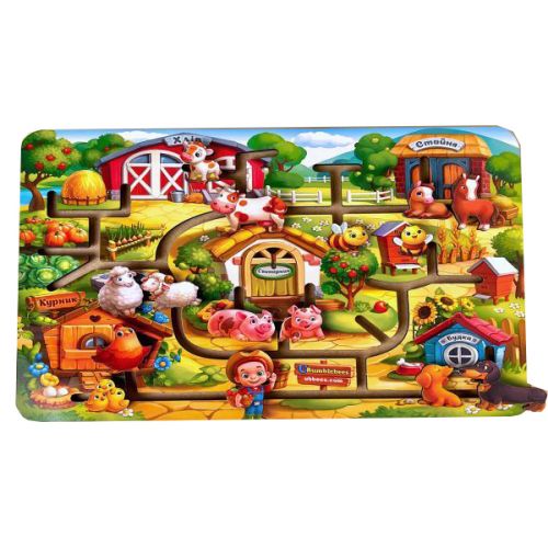 Деревʼяна гра-лабіринт “Ферма”. Складається з деревʼяної дошки з жолобками, за якими, за допомогою паличок з переміщуються фігурки тварин. Пересуваючи їх у певному порядку, дитина розвиває координацію, окомір, дрібну моторику рук та спостережливість. Іграшка дуже яскрава, виготовлена із якісної деревини.