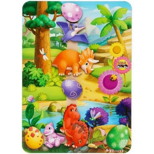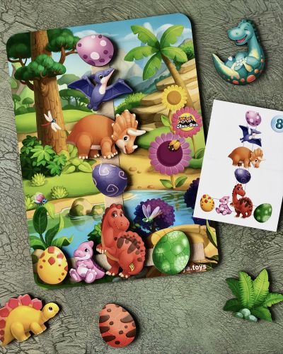 Гра складається з тематичного планшету-фону з липучкою (горизонтальною і вертикальною – вчимо напрямки) і 18 різних елементів на липучках. У наборі також йдуть картки з візуальними завданнями різного рівня складності: повторити по картинці, по контуру, за силуетом. Дитині потрібно розташувати динозавриків, яйця і і кущики так, як це показано на картці-схемі. Поговоріть з дитиною про те, хто з динозаврів травоїдний, а хто хижак.