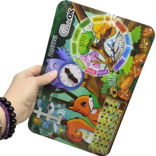 Деревʼяний каледарик з безліччю інтерактивних елементів, які допоможуть дитині вивчити пори року, погоду, дні тижня та числа, а також навчить користуватися аналоговим годинником. Іграшка виконана з екологічних та безпечних для дитини матеріалів. У комплекті є зручна підставка для календаря. Розмір: 29 х 19.5 см.