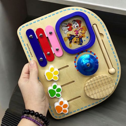 Багатофункціональна панель – натхнення для маленького музиканта. Подарує малюку багато годин захопливої імпровізації. 4 музичні інструменти: ксилофон, тріскачка, тарілка та барабан. 3 тумблери-лапки, які можна рухати вниз та вгору. Яскраві кольори та персонажі улюбленого мультфільму зроблять гру ще цікавішою.