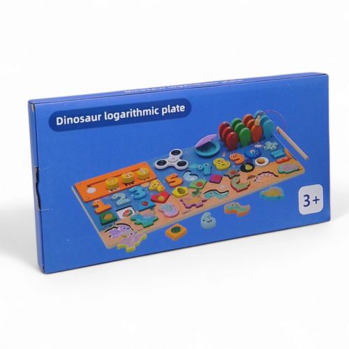 Комплектація: Дерев’яна рамка, 8 динозаврів, 10 цифр, 3 математичні знаки, 12 рібок, вудка, 10 фігур