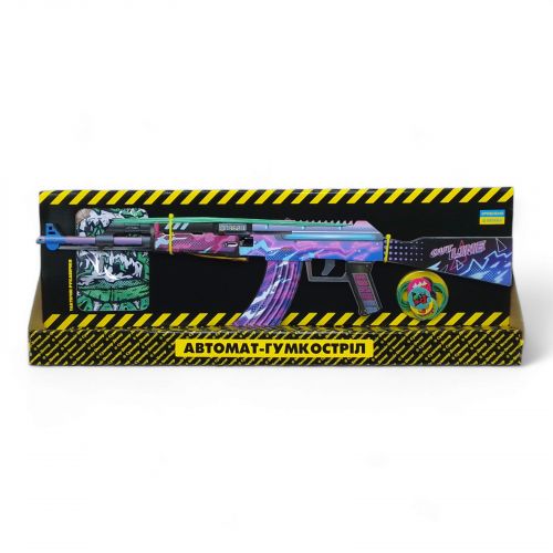 Деревʼяний автомат, який стріляє резинками. Розмір зброї – 59 см.