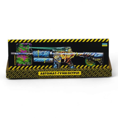 Деревʼяний автомат, який стріляє резинками, з глушником. Розмір зброї – 58 см.