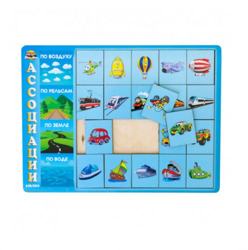 Дерев’яна гра “Асоціації”. Складається з планшета і дерев’яних фішок. Потрібно вибудовувати асоціативний ряд. Відмінно тренує дрібну моторику, логіку, пам’ять, увагу, мислення. Розмір рамки – 32,5х23 см.