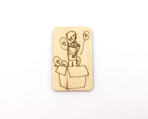 Дерев’яна основа у вигляді хлопчика з букетом квітів, який стоїть в подарунковій коробці, прикрашеній кульками, до задньої частини якої прикріплений магнітик. Основа не пофарбована, що залишає місце для фантазії і творчого прояву. Розфарбувавши хлопчика по своєму смаку, виріб можна прикріпити на холодильник або іншу магнітну поверхню. Основа виготовлена з якісної деревини.