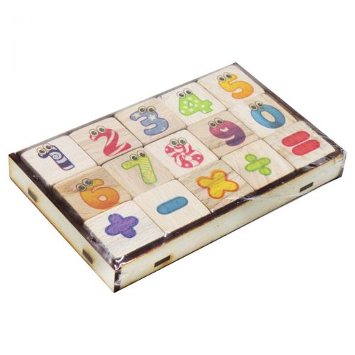 Дерев’яні кубики для вивчення математики. На кубиках намальовані цифри від 0 до 9 та різні математичні знаки, всього 15 кубиків у наборі. Виконано з якісних та безпечних матеріалів.