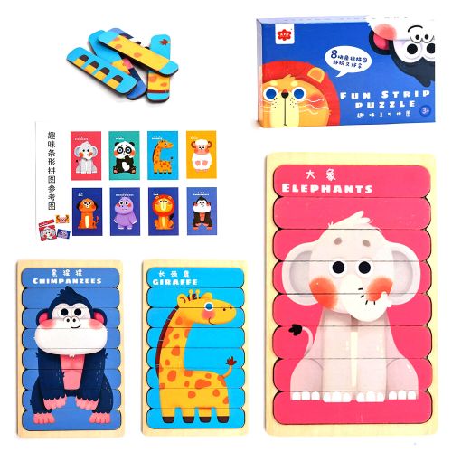 Пазли “Fun Strip” унікальні формою своїх елементів – вони виконані у вигляді тонких смужок. У наборі є 4 комплекти двосторонніх смужок, з яких можна скласти 8 різних зображень. Такі пазли підійдуть навіть найменшим діткам від 3-х років.