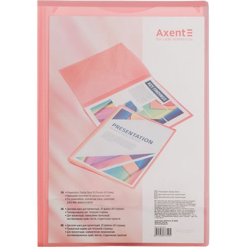 Дисплей-книги – це чудове рішення для роботи, навчання і організації особистих архівів, підбірок. Помістивши документи з певної теми або проекту в окрему дисплей-книгу, можна не тільки вирішити питання зручної систематизації та зберігання документів, але і при необхідності брати з собою і презентувати їх, просто гортаючи файли в дисплей-книзі. Дисплей-книги Axent виготовлені з первинного поліпропілену, щільність пластику обкладинки і файлів передбачає їх зносостійкість і збереження презентабельного вигляду в процесі використання. Файли надійно впаяні в обкладинку. Додатковий функціонал, прозора зовнішня кишеня, дозволяє розмістити власну титульну сторінку на обкладинку, викликаючи цікавість до змісту презентації.