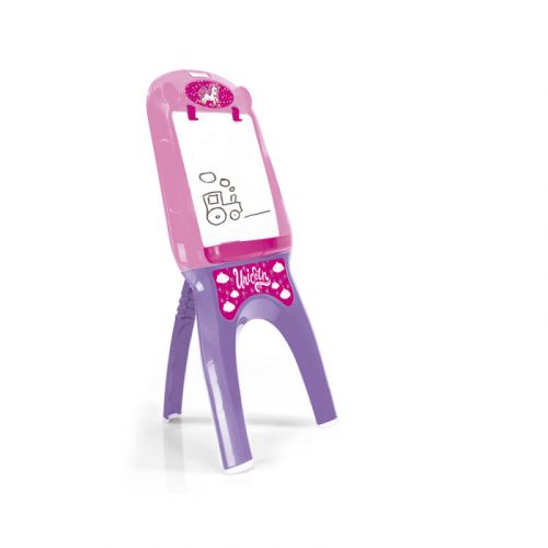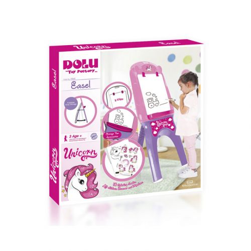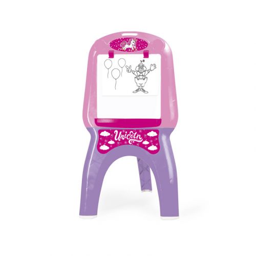 Дитячий мольберт для малювання виконаний у тематиці єдинорогів. Розмір у зібраному вигляді – 105 х 59 х 37 см. Біла поверхня для малювання маркерами, лоток для художнього приладдя. 10 картинок-розмальовок, набір наклейок, маркер та губка йдуть у комплекті.