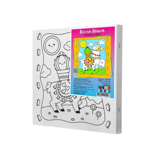 Комплектація: синтетичне полотно з нанесеними контурами майбутнього малюнка, натягнуте на дерев’яну рамку; водорозчинні акрилові фарби; пензлик
