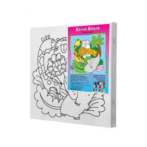 Комплектація: синтетичне полотно з нанесеними контурами майбутнього малюнка, натягнуте на дерев’яну рамку; водорозчинні акрилові фарби; пензлик