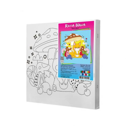 Комплектація: синтетичне полотно з нанесеними контурами майбутнього малюнка, натягнуте на дерев’яну рамку; водорозчинні акрилові фарби; пензлик