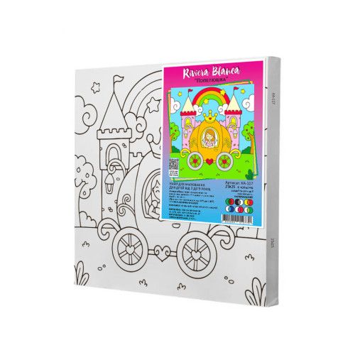 Комплектація: синтетичне полотно з нанесеними контурами майбутнього малюнка, натягнуте на дерев’яну рамку; водорозчинні акрилові фарби; пензлик