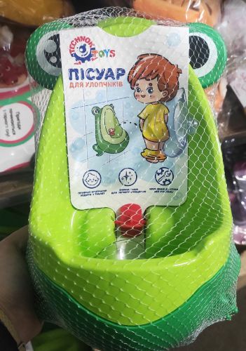 Дитячий пісуар у вигляді жаби. Виготовлений із яскравого пластику, який легко миється. Призначений для хлопчиків віком від 1,5 року. Пісуар оснащений двома кріпленнями-присосками, завдяки яким пристрій можна підвішувати на зручній для дитини висоті. Також його можна кріпити на дюбель (не йде у комплекті). Пісуар складається з двох частин: зовнішня частина кріпиться до вертикальної поверхні (бажано керамічної плитки), а внутрішня – легко виймається, що дозволяє її мити. Усередині пісуару розташована крильчатка, яка починає крутитися, при попаданні на неї струменя. Такий захоплюючий ігровий процес допоможе привчити вашого малюка користуватися пісуаром. Різні кольори в асортименті.