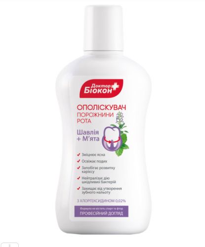 Рекомендований для щоденного професійного догляду за ротовою порожниною. Дія антибактеріального та дезінфікуючого компонента хлоргексидину, а також ефірних олій шавлії та мʼяти спрямована на боротьбу з бактеріями та зміцнення ясен. Ополіскувач добре очищає зубоясенні кишені та міжзубні проміжки. Усуває неприємний запах з рота, освіжає дихання, перешкоджає утворенню зубного нальоту.