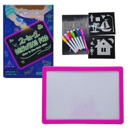 Двостороння дошка для звичайних маркерів та маркерів, які світяться у темряві. Може бути як цікавою забавкою для дітей у вільний час, так і освітньою іграшкою для дошкільнят. Вона дозволить малювати та писати все, що заманеться – тому можна як робити гарні малюнки, так і розв’язувати приклади. Її портативність та компактний розмір дозволяють брати її з собою куди завгодно, надаючи дитині простір для творчості. До дошки у комплект йдуть трафарети та маркери “пиши-стирай”.