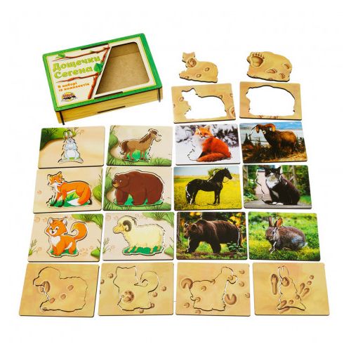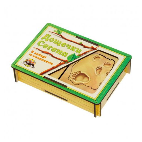 Дощечки Сегена – набір, в якому для кожного вкладиша потрібно підібрати будиночок-рамку. У комплекті 18 рамок і 18 вкладишів, відповідно. Відмінно розвиває дрібну моторику, пам’ять, увагу, логіку.