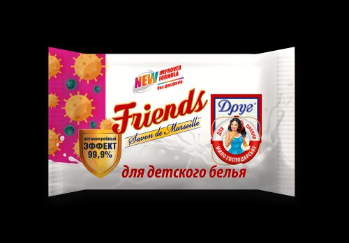 Унікальна формула спеціально розроблена науково-виробничою лабораторією підприємства, яка містить спеціальні добавки спрямованої дії, що забезпечують чотирьом видам мила яскраво виражені властивості: відбілювання, видалення плям, дбайливу дію на делікатні тканини і шкіру рук, спеціальні властивості для ефективного прання дитячої білизни. Господарське мило Друг створено з високоякісної сировини рослинного походження. Всі види лінійки містять приємні парфумерні композиції, які надають білизні аромат чистоти та свіжості. Створено з урахуванням специфки прання дитячої білизни, до його складу входить додатковий оптичний відбілювач, а також добавка, що має дезінфікуючу властивість. Мило легко виполіскується. Білизна, випрана господарським милом Friends , не подразнює ніжну шкіру дитини.