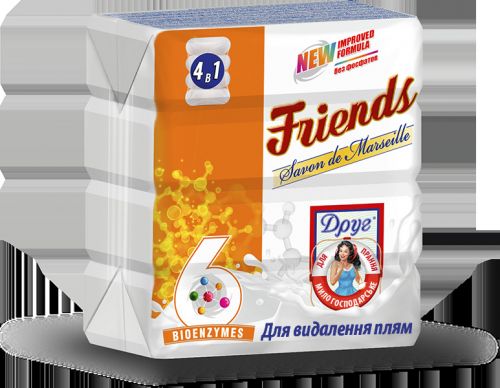 Господарське мило активної дії! Ніколи ще чистота не була такою доступною! Господарське мило Friend`s створено з високоякісної сировини рослинного походження – пальмової та кокосової олій. Унікальна формула господарського мила «Друг» спеціально розроблена науково-виробничою лабораторією підприємства ТОВ «Слобожанський миловар», вона включає спеціальні добавки спрямованої дії, що забезпечують чотирьох видів мила яскраво виражені властивості: відбілювання, видалення плям, щадного впливу на делікатні тканини і шкіру рук, спеціальні властивості для ефективного прання дитячої білизни. Всі види господарського мила «Друг» мають приємні парфумерні композиції, які надають білизні аромат чистоти і свіжості. До складу мила введена ефективна добавка, сприяє видаленню плям з тканини. Для найбільш ефективного прання рекомендовано нанести мило на пляму на 10-15 хвилин, а потім прати як звичайно. Застарілі плями можна обробити двічі.
