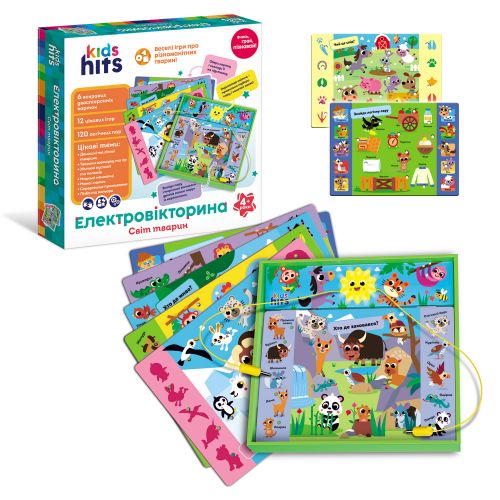 Яскрава та цікава електровікторина в ігровій формі познайомить малюка з різноманітним світом тварин. Веселі сюжети, яскраві ілюстрації та цікаві логічні завдання не дадуть занудьгувати. Обирай будь-яку з тем, а модуль-сонечко, що світиться, підкаже, чи правильно ви виконали завдання.Теми: Домашні та лісові тварини; Тварини зоопарку та гір; Жителі пустелі та полюсів; Морські мешканці; Мама і малюк; Середовище проживання; Лічба та кольори. У комплекті: 6 яскравих двосторонніх карток; сонечко-індикатор. Гра рекомендована для діток старше 4-х років.