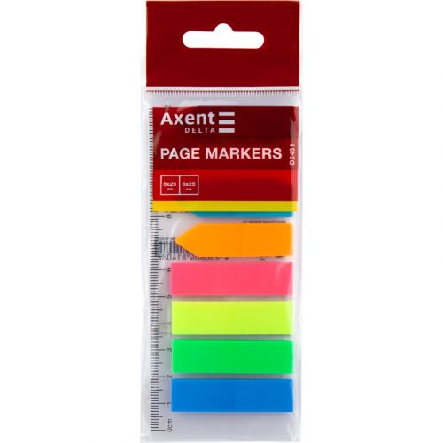 Закладки дуже зручні для створення позначок в записних книжках, документах, книгах, каталогах і т.д., щоб при необхідності легко знайти потрібну сторінку або зазначене місце. Перевага закладок в тому, що вони легко видаляються з поверхні, не залишаючи ніяких слідів на папері. Закладки Delta by Axent мають прямокутну форму і форму стрілок (закладки-стрілки зручні в тих випадках, коли необхідно відзначити якийсь конкретний рядок в тексті документа, саме на нього і наклеюється “стрілка”), виготовлені з прозорого пластику яскравих неонових кольорів. Завдяки матеріалу ці закладки придатні для багаторазового використання. На закладках можна наносити позначки. Яскраві кольори допомагають їм не залишитися непоміченими у стосі документів. Розмір закладки 12х45 мм, 8 кольорів. В упаковці 200 шт.