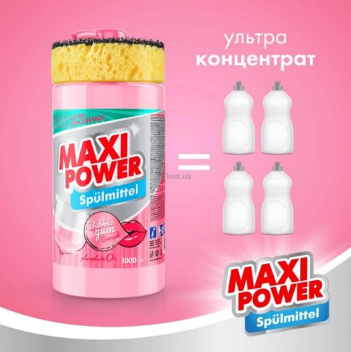 Мити посуд приємніше, коли забруднення зникає легко і без зайвого тертя. Саме так працює засіб для миття посуду MAXI POWER. Рідкий концентрат має безпечний склад та ще більше переваг перед звичайними мийними засобами: унікальна формула на основі соди відмиває посуд до блиску; безфосфатний, безпечний склад береже ваші руки від подразнень; якісний засіб не залишає на поверхнях фенольної плівки; приємний аромат жувальної гумки не набридає кожен день; концентрат втричі економніший за звичайні засоби. Ефективний склад рідини містить воду, соду, харчовий барвник та до 15% поверхнево-активних речовин, що є біорозкладними та не шкодять довкіллю. Завдяки потужній формулі засіб швидко та надійно справляється з жиром та брудом, добре змивається і залишає посуд скрипучим та блискучим. Концентрату вистачає на довше, адже для одного миття вам знадобиться лише декілька крапель засобу. Спеціальний бонус до кожної літрової пляшки — делікатна губка для миття посуду у подарунок! Обирайте MAXI POWER. Купуйте якісну європейську продукцію від вітчизняного виробника.