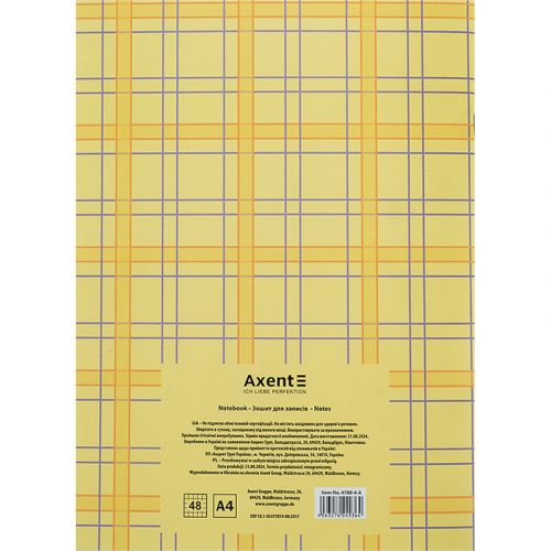 Зошит для записів Axent призначений для щоденних записів, ведення обліку, замальовки схем, графіків, фіксації великого обсягу інформації. М’яка обкладинка, кріплення на скобі. Білий папір в клітинку забезпечує комфортне письмо. Щільність паперу 55г/м2. Формат – стандартний, А4. Кількість аркушів – 48 в клітинку. Обкладинка: мелований картон щільністю 230 г/м² .