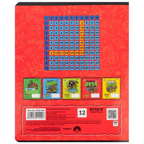 Зошит шкільний на скобі Kite має 12 аркушів, представлений у зручному форматі А5. Аркуші в зошиті зроблені зі щільного паперу, розлініяні в клітинку. Виріб представлено в ущільненій кольоровій обкладинці з ліцензованим зображенням в 5 дизайнах. Ефект на обкладинці: гібридний лак та вибірковий УФ лак. Кольорова задруківка форзаца.