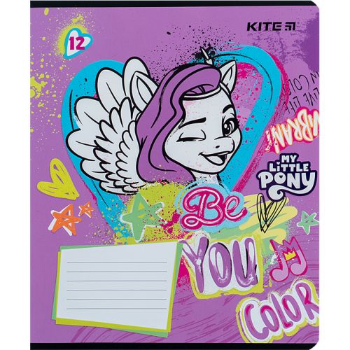 Зошит шкільний на скобі Kite має 12 аркушів, представлений у зручному форматі А5. Аркуші в зошиті зроблені зі щільного паперу, розлініяні в лінію. Виріб представлено в ущільненій кольоровій обкладинці з ліцензованими зображеннями в 5 дизайнах. Ефект на обкладинці:уф-лак+глітер з гібридним лаком. Кольорова задруківка форзаца.
