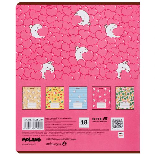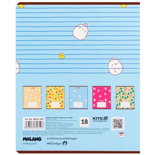 Зошит шкільний на скобі Kite має 18 аркушів, представлений у зручному форматі А5. Аркуші в зошиті зроблені зі щільного паперу, розлініяні в лінійку. Виріб представлено в ущільненій кольоровій обкладинці з ліцензованими зображеннями в 5 дизайнах. Ефект на обкладинці: гібридний лак та вибірковий УФ-лак. Кольорова задруківка форзаца.