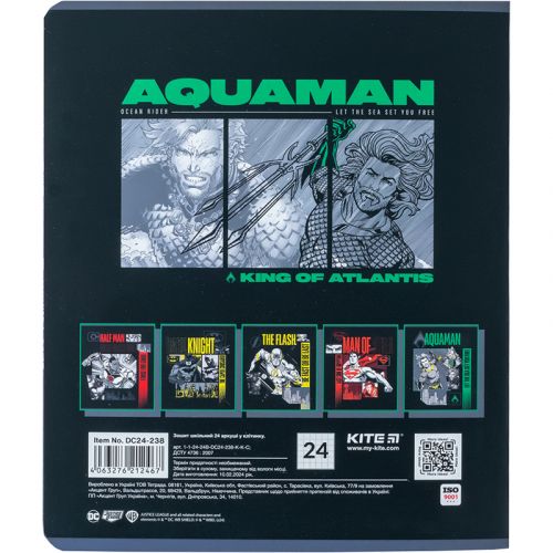 Зошит шкільний на скобі Kite має 24 аркуші, представлений у зручному форматі А5. Аркуші в зошиті зроблені зі щільного паперу, розлініяні в клітинку. Виріб представлено в ущільненій кольоровій обкладинці в 5 дизайнах. Ефект на обкладинці: софт тач ламінація та УФ лак . Кольорова задруківка форзаца, подвійна обкладинка.