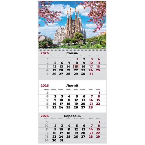 Календар Axent на 2026 рік. • Настінний квартальний календар на 1 пружину, • На одному аркуші 3 місяці, розмір виробу 297 * 630 мм • Розмір постера 297 * 210 мм, виготовлений з високоякісного картону • Календарний блок 12 відривних аркушів розміром 297 * 420 мм, виготовлені з крейдованого паперу • Календарна сітка на українській мові • Вказівник дат із бігунком та отвір для кріплення • Кожен календар в індивідуальній упаковці
