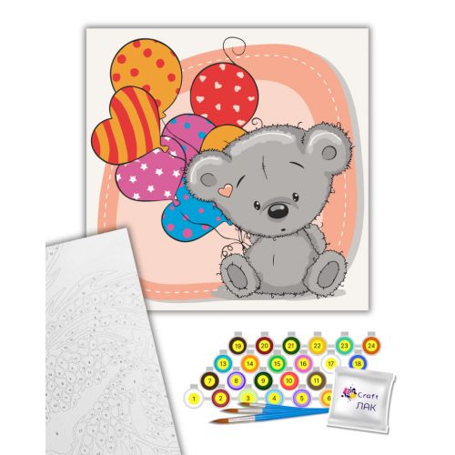 Картина за номерами. Для того, щоб намалювати картину, необхідно малювати за пронумерованими контурами, які відповідають кольору фарби. У наборі: полотно на підрамнику з галерейною натяжкою, паперовий дублікат з контурним малюнком картини (на картині нанесена схема контурів зображення з нумерацією), художні нейлонові пензлі, палітра акрилових фарб у контейнерах. Усі необхідні фарби вже в комплекті та не вимагають змішування. Розмір: 30х30 см.