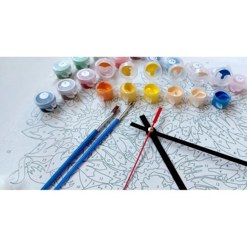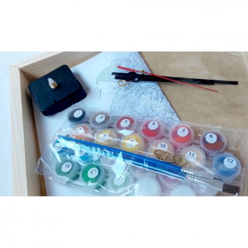 Комплектація: годинниковий механізм зі стрілками, ДВП на широкому підрамнику (2,5 см.), паперова інструкція з контурним малюнком картини (на картині нанесена схема контурів зображення з нумерацією), нейлонові художні пензлі, палітра акрилових фарб у контейнерах та зручне кріплення