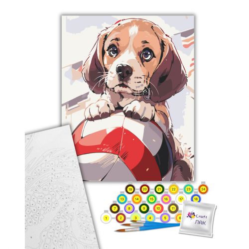 Комплектація: полотно на підрамнику з галерейною натяжкою, паперовий дублікат з контурним малюнком картини (на картині нанесена схема контурів зображення з нумерацією), художні нейлонові пензлі, палітра акрилових фарб у контейнерах