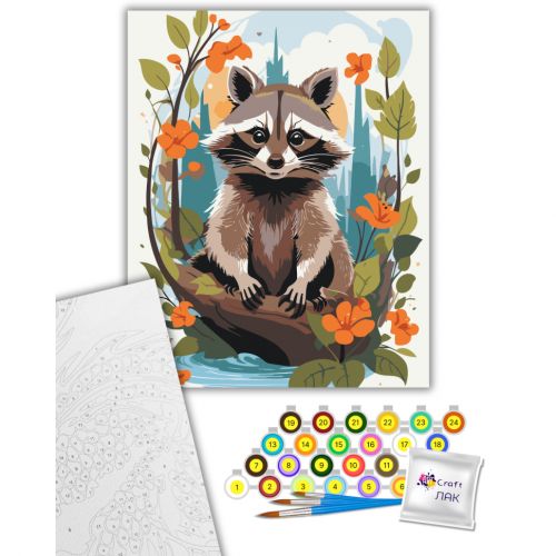 Комплектація: полотно на підрамнику з галерейною натяжкою, паперовий дублікат з контурним малюнком картини (на картині нанесена схема контурів зображення з нумерацією), художні нейлонові пензлі, палітра акрилових фарб у контейнерах