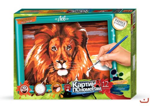 Картина за номерами (320х230 мм). У наборі: рамка, 12 акрилових фарб (основні кольори + відтінки), пензлик, контурна заготовка 2 шт., Інструкція.