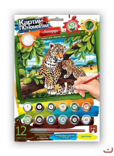 Картина за номерами (297х210 мм). У наборі: 12 акрилових фарб (основні кольори + відтінки), пензлик, контурна заготовка 2 шт., Інструкція.