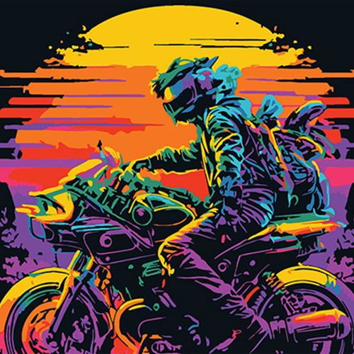 Картина за номерами на чорному фоні “Гонщик на мотоциклі у вогні заходу сонця” 30х30 см