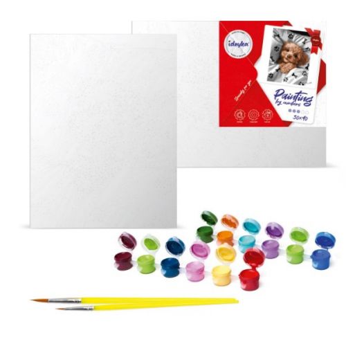 Комплектація: полотно на підрамнику з галерейною натяжкою, паперовий дублікат з контурним малюнком картини (на картині нанесена схема контурів зображення з нумерацією), художні нейлонові пензлі, палітра акрилових фарб у контейнерах