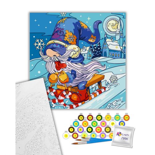 Комплектація: полотно на підрамнику з галерейною натяжкою, паперовий дублікат з контурним малюнком картини (на картині нанесена схема контурів зображення з нумерацією), художні нейлонові пензлі, палітра акрилових фарб у контейнерах