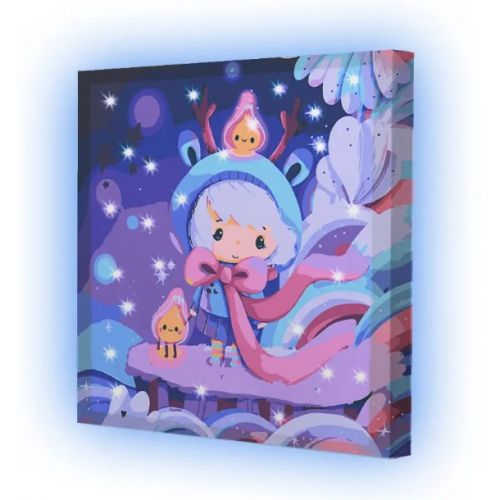 Комплектація: полотно на підрамнику з галерейною натяжкою, паперовий дублікат з контурним малюнком картини (на картині нанесена схема контурів зображення з нумерацією), художні нейлонові пензлі, палітра акрилових фарб у контейнерах, зі світлодіодною підсвіткою.