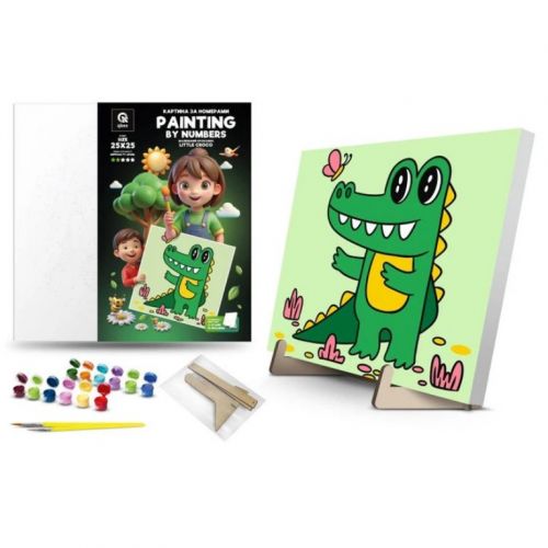 Дитяча картина за номерами. Для того, щоб намалювати картину, необхідно малювати за пронумерованими контурами, які відповідають кольору фарби. У наборі: полотно на підрамнику з галерейною натяжкою, художні нейлонові пензлі, палітра акрилових фарб у контейнерах, деревʼяні деталі підставки для картини. Усі необхідні фарби вже в комплекті та не вимагають змішування. Розмір: 25х25 см. Рекомендовано для дітей старше 5 років.